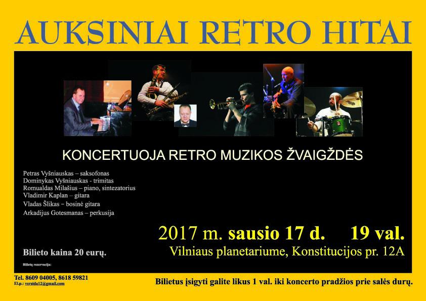 17 января в 19. 00 в зале Вильнюсского планетария начнётся концерт звёзд литовской эстрады. С лучшими хитами прошлых лет выступят музыканты Пятрас Вишняускас, Доминикас Вишняускас, Ромуальдас Милашюс, Владимир Каплан и Владас Шликас. obzor.lt »