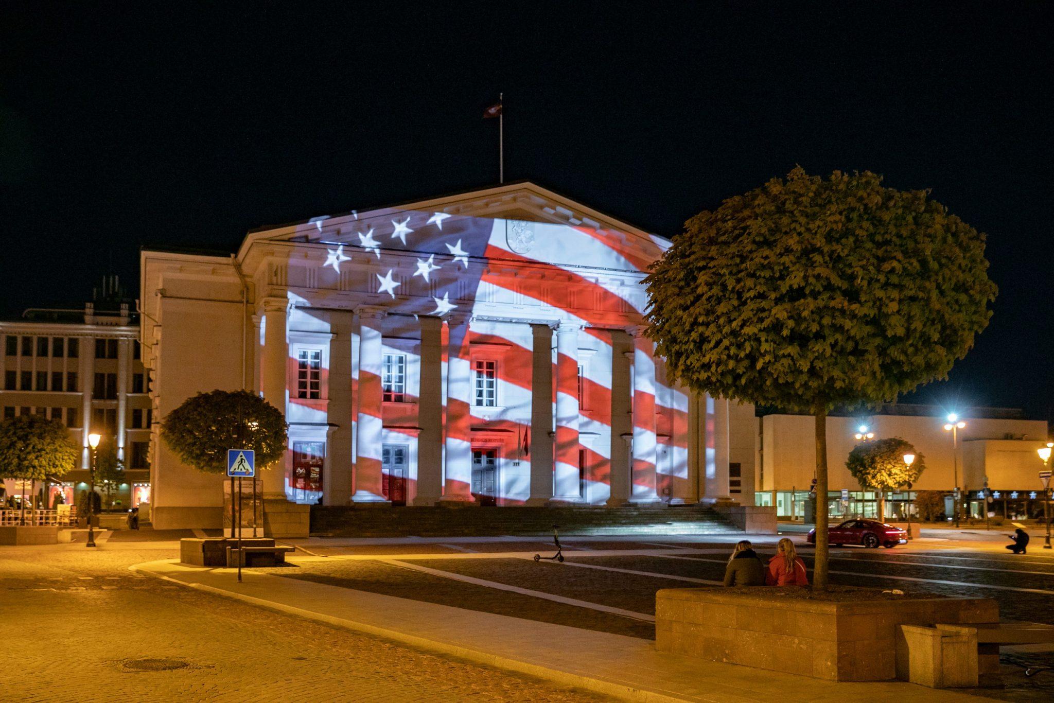 На прошлой неделе, в среду поздно вечером, в Вильнюсе в знак поддержки американцев, борющихся с болезненными последствиями пандемии коронавируса, здание Ратуши было освещено видеопроекцией флага США.