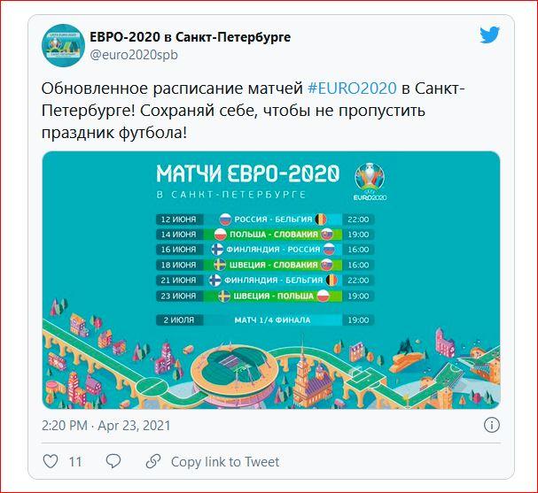 Санкт-Петербург примет дополнительные матчи финальной части чемпионата Европы по футболу 2021 года. Об этом сообщает ТАСС со ссылкой на пресс-службу Союза европейских футбольных ассоциаций (УЕФА). Изначально Санкт-Петербург должен был принять четыре матча финальной части турнира - три встречи группового этапа, в том числе две игры с участием сборной России, и один из четвертьфиналов...