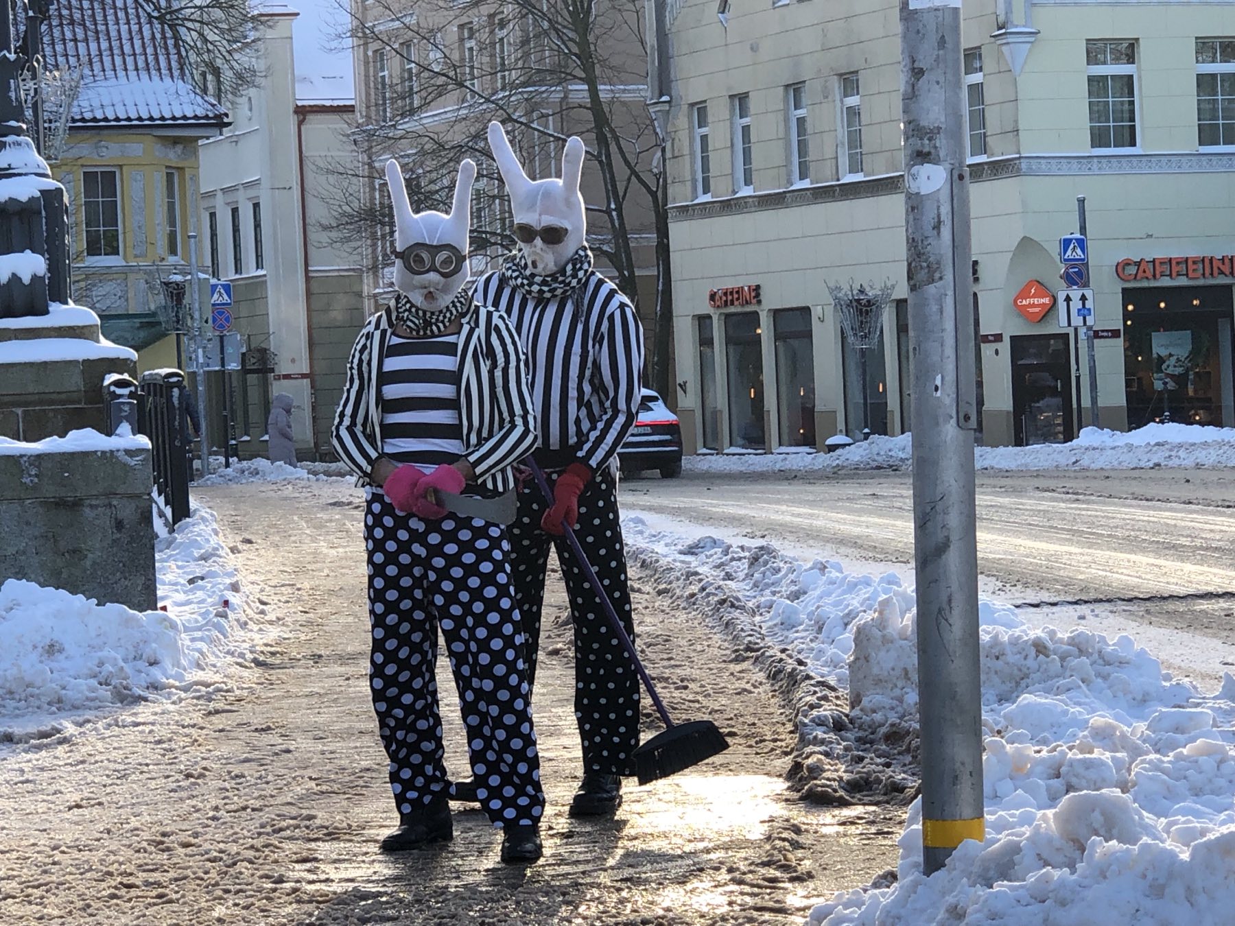 На днях жители Клайпеды стали свидетелями весьма странного действия: улицу от снега стали очищать . . . зайцы! Зайцы тоже, кстати, были весьма странные: то ли заключённые, отбывающие повинность, то ли совсем наоборот - в одежде судей, хоккейных.